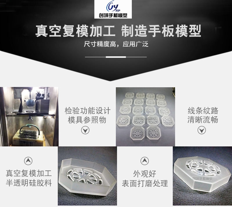 半透明硅膠手板由真空復(fù)模加工,即利用原有的樣板,在真空狀態(tài)下制作出硅膠模具,并在真空狀態(tài)下采用PU 材料進(jìn)行澆注,從而克隆出與原樣板相同的復(fù)制件。該項(xiàng)技術(shù)由于速度快、成本底、大大降低了產(chǎn)品的開發(fā)費(fèi)用、周期和風(fēng)險(xiǎn)。制作硅膠模具的材料有: 國產(chǎn)硅膠、進(jìn)口硅膠、透明硅膠、特種硅膠。復(fù)制產(chǎn)品采用材料:國產(chǎn)PU 、進(jìn)口PU 、透明PU 、軟PU 、賽鋼、ABS、PP、PC耐高溫的ABS 等。